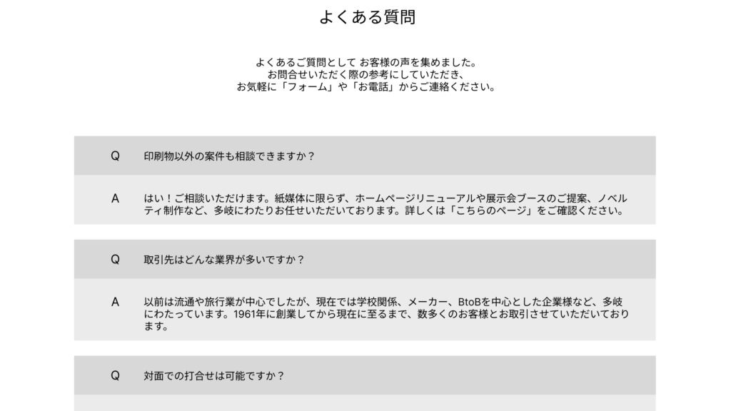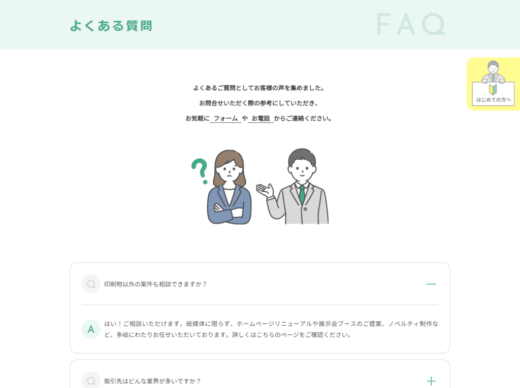 まずはここで疑問を解消していただいてから、サービスページなどの具体的な内容へ移っていただくのもおすすめです。