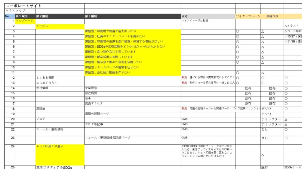 「どれだけ原稿が必要なのか」「どこに問合せフォームを配置すると見やすいのか」など、やるべきことや課題点が見える化できます。